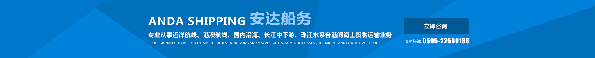 福建安達船務有限公司(FUJIAN ANDA SHIPPING CO.,LTD)成立于一九九二年,企業類型為有限責任公司,法定代表人:陳其泗,注冊資本人民幣貳仟萬元,統一社會信用代碼:91350521156221168Y,水路運輸許可證:交閩XK0184。公司現有CCS入級散貨輪4艘,總運力8.2萬噸,船舶技術狀況良好。公司管理制度完善,組織機構健全,擁有一個專業、穩定的管理團隊。公司按照 NSM規則建立了安全管理體系,在船岸保持有效運行,并通過海事局審核取得了NSM規則的符合證明。